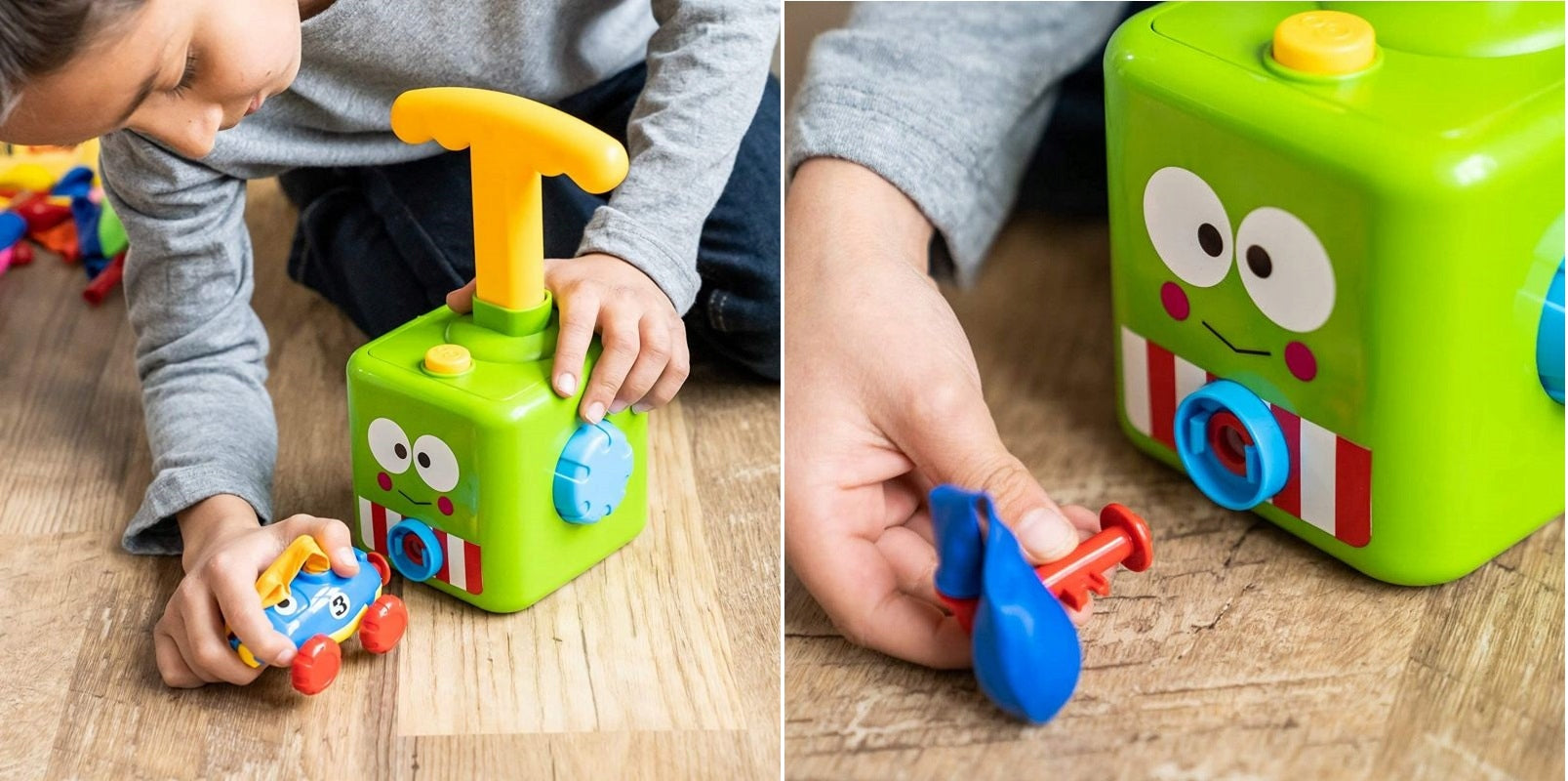 Zabawka działa na zasadzie napędu powietrznego – bez baterii i bez kabli. Dziecko pompuje balonik za pomocą stacji, a samochodzik rusza do przodu dzięki sile powietrza. To świetny sposób, by pokazać dziecku podstawy nauki o ciśnieniu, aerodynamice i energii.
