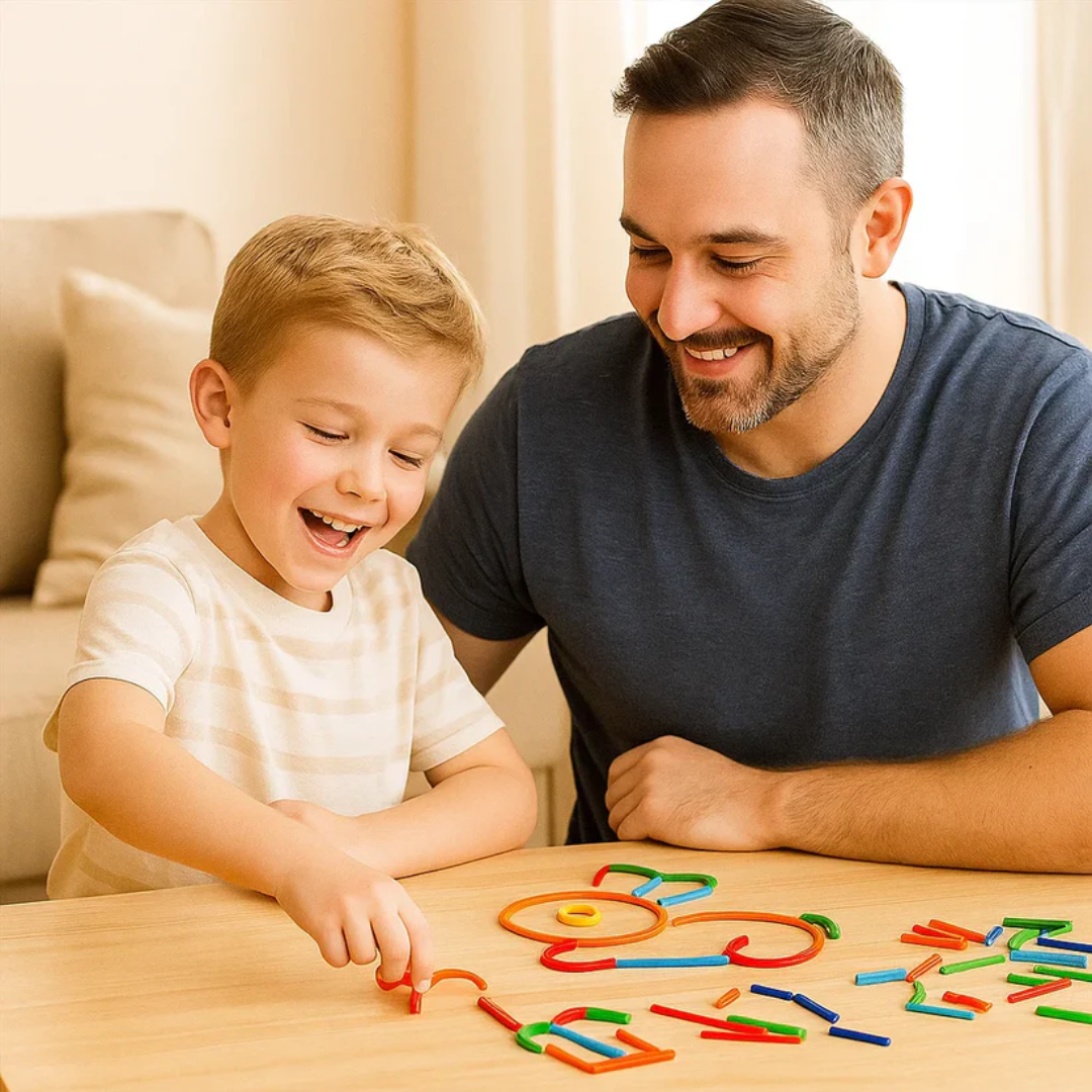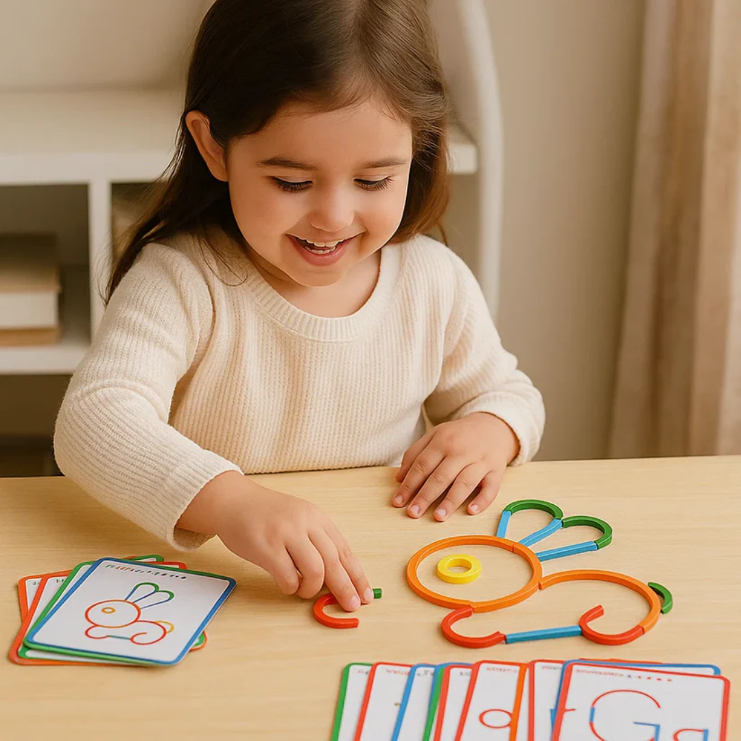 Układanka pozwala dziecku na tworzenie własnych wzorów z pierścieni i patyczków, co pobudza wyobraźnię i logiczne myślenie.